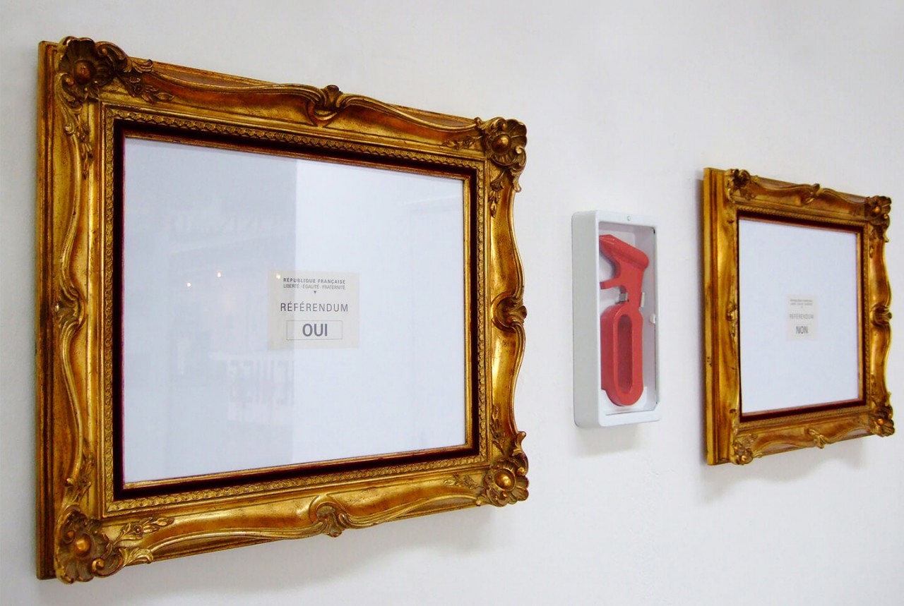 Installation avec cadres et bulletins de vote sous verre marteau brise-glace, 45 x 140 cm, édition 3/3,